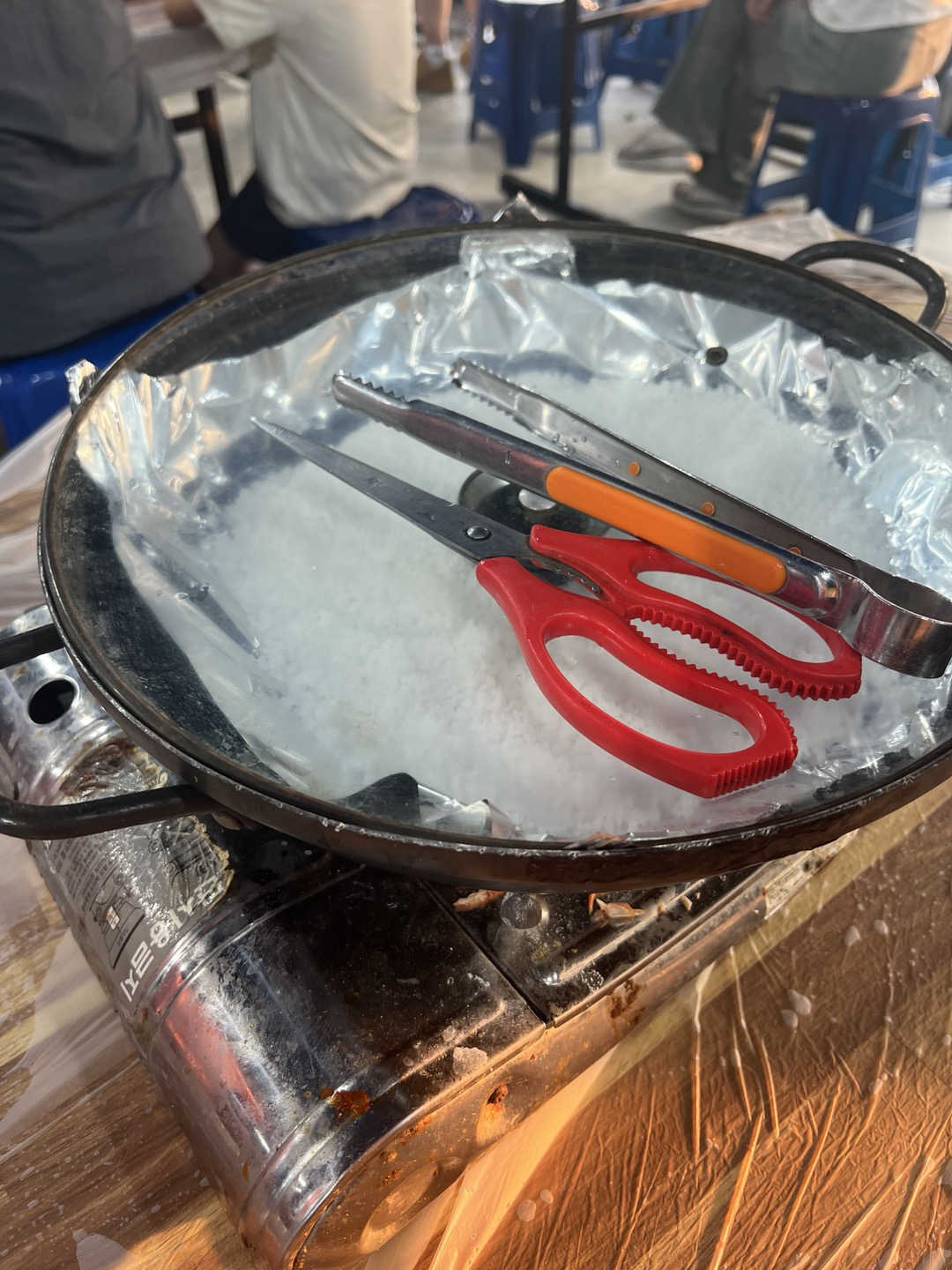 새우는 1kg에 35,000원 이었다. 새우를 사와서 기다리면 아저씨가 불판에 새우 넣어주심.